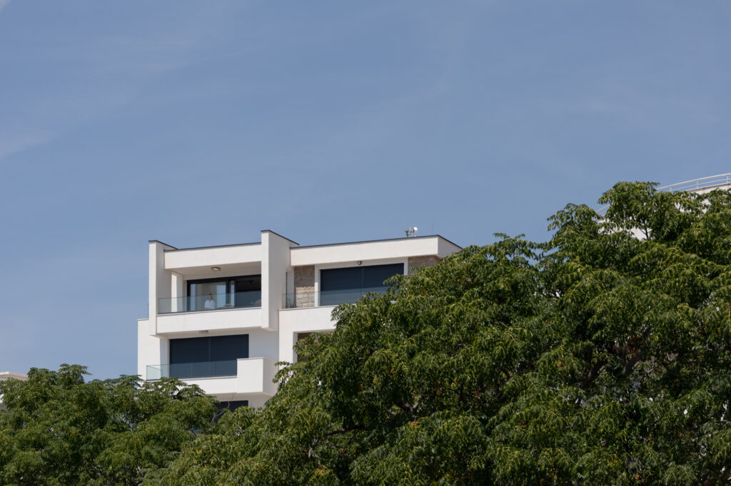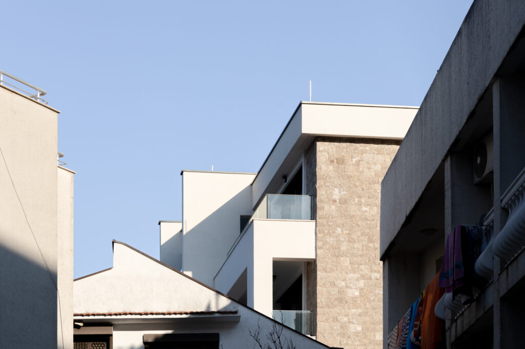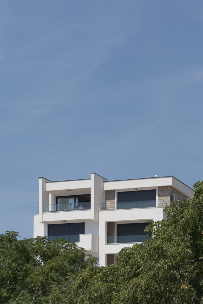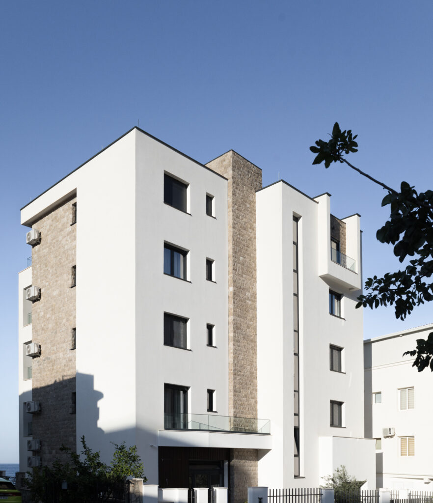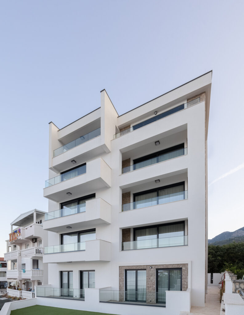 Eksterijer zgrade kombinuje čistu bijelu fasadu sa pažljivo integrisanim elementima od prirodnog kamena – promišljeni omaž tradicionalnoj arhitekturi Crne Gore. Minimalistička forma od betona, sa jednostavnim balkonima i upečatljivim linijama, odražava modernu interpretaciju regionalnih građevinskih stilova. Ovaj spoj tradicije i inovacije dodatno naglašavaju velike staklene površine koje propuštaju prirodnu svjetlost u svaki prostor i uokviruju zadivljujuće poglede na Jadran.