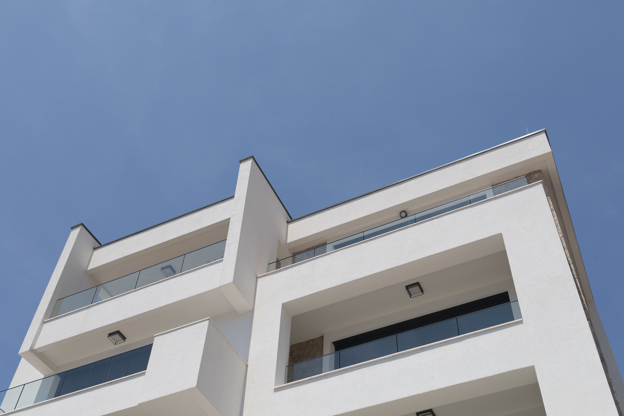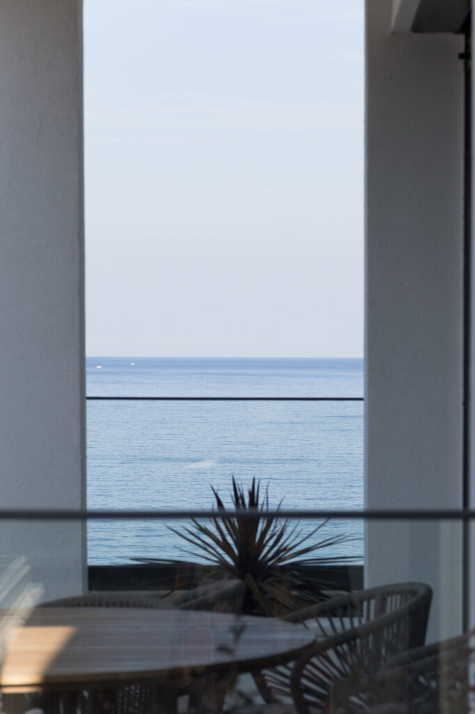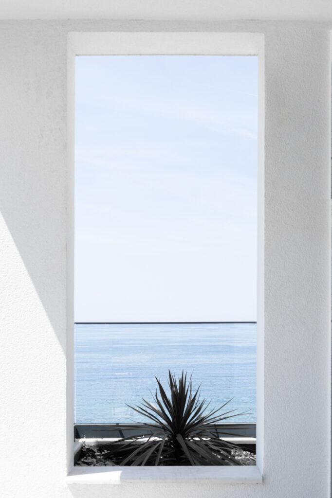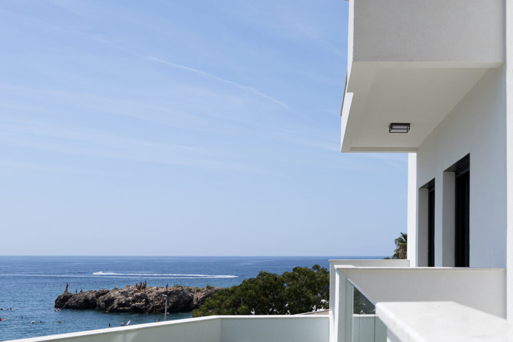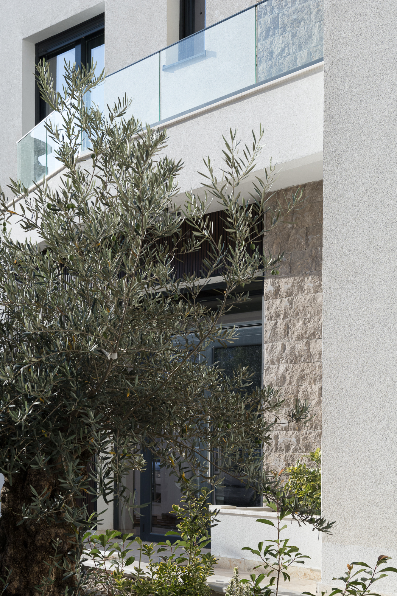 Eksterijer zgrade kombinuje čistu bijelu fasadu sa pažljivo integrisanim elementima od prirodnog kamena – promišljeni omaž tradicionalnoj arhitekturi Crne Gore. Minimalistička forma od betona, sa jednostavnim balkonima i upečatljivim linijama, odražava modernu interpretaciju regionalnih građevinskih stilova. Ovaj spoj tradicije i inovacije dodatno naglašavaju velike staklene površine koje propuštaju prirodnu svjetlost u svaki prostor i uokviruju zadivljujuće poglede na Jadran.