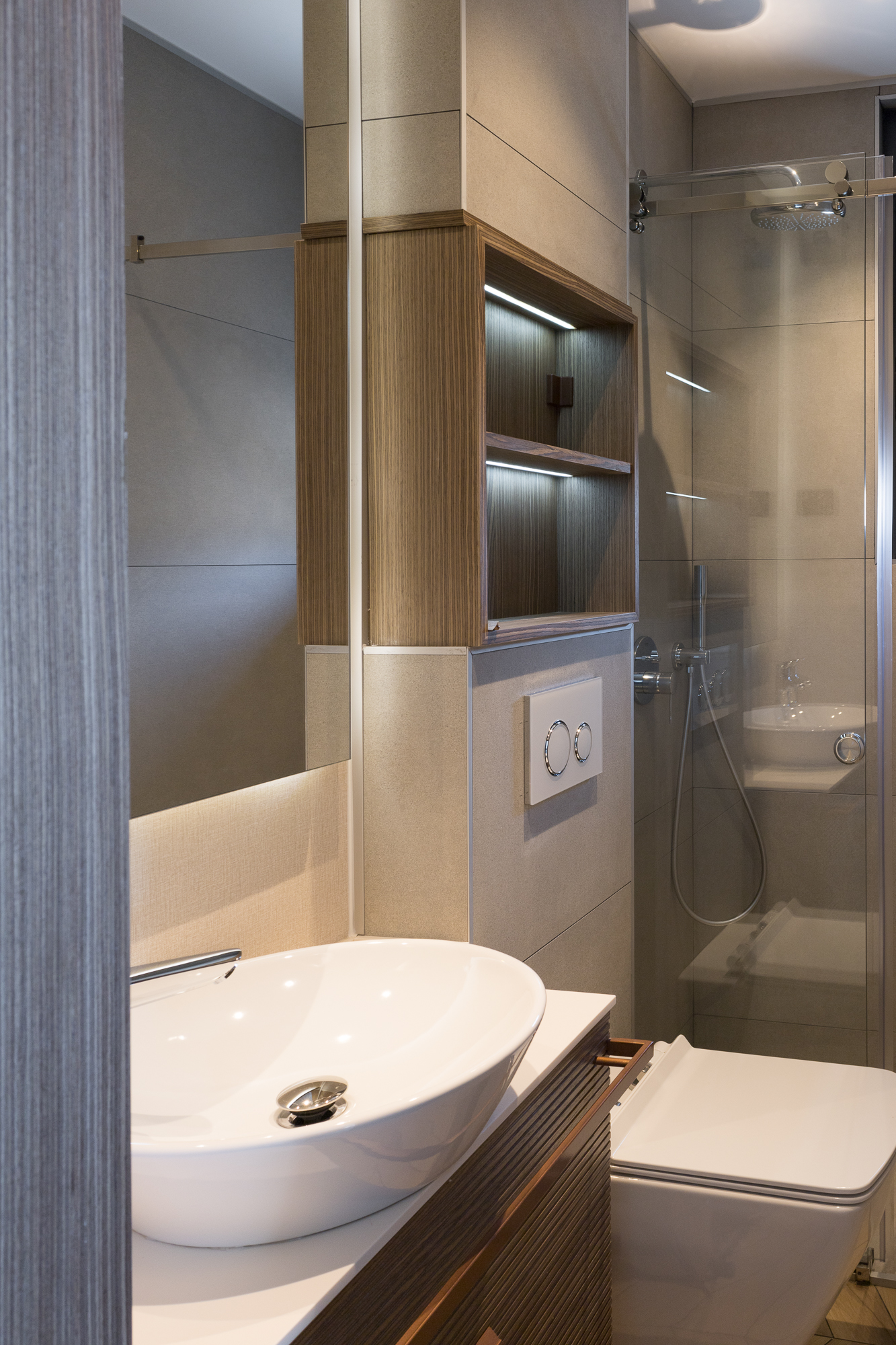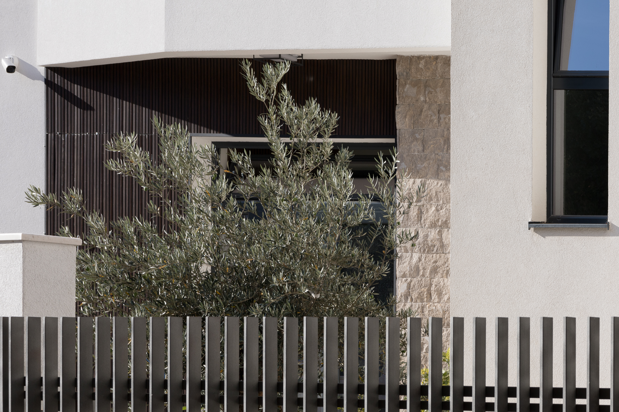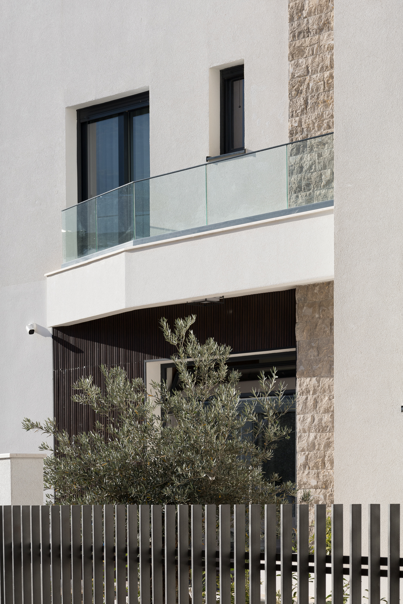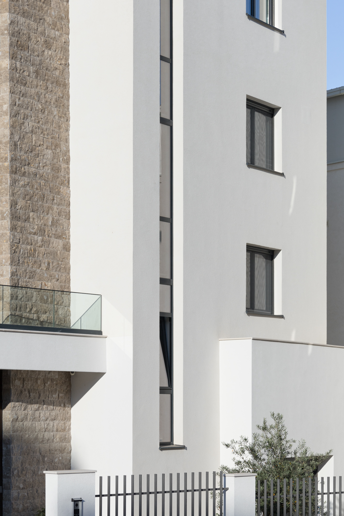 Eksterijer zgrade kombinuje čistu bijelu fasadu sa pažljivo integrisanim elementima od prirodnog kamena – promišljeni omaž tradicionalnoj arhitekturi Crne Gore. Minimalistička forma od betona, sa jednostavnim balkonima i upečatljivim linijama, odražava modernu interpretaciju regionalnih građevinskih stilova. Ovaj spoj tradicije i inovacije dodatno naglašavaju velike staklene površine koje propuštaju prirodnu svjetlost u svaki prostor i uokviruju zadivljujuće poglede na Jadran.