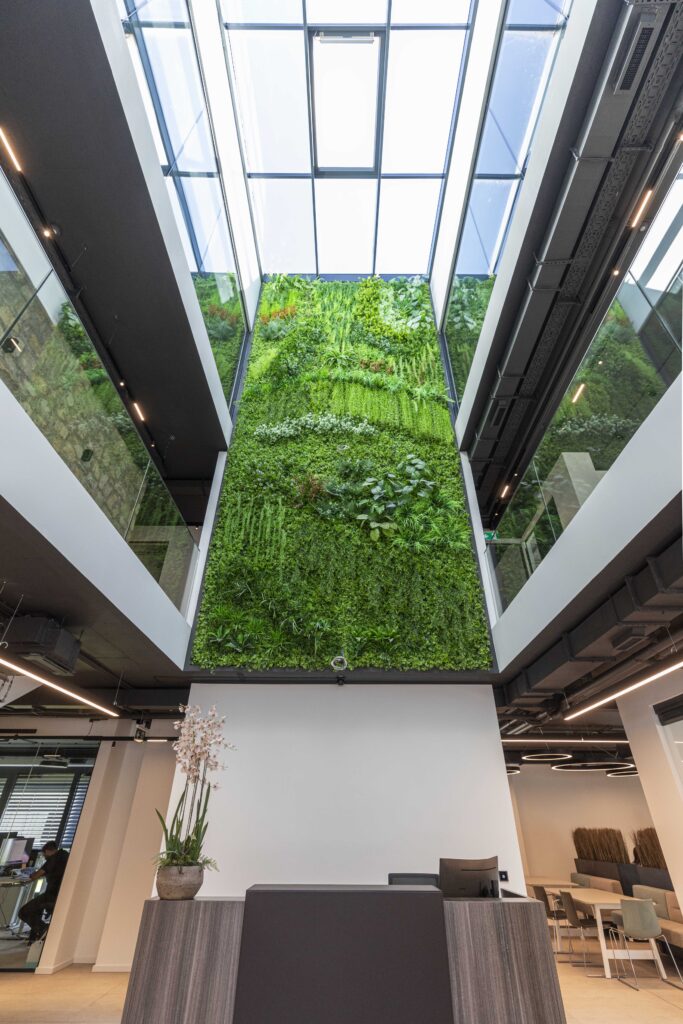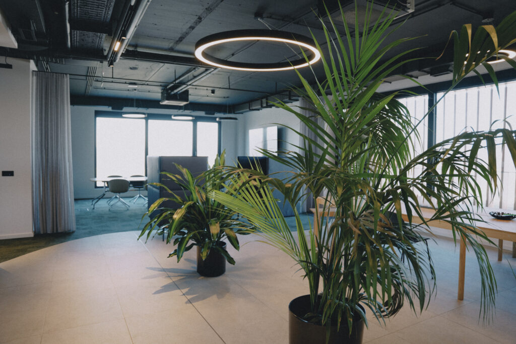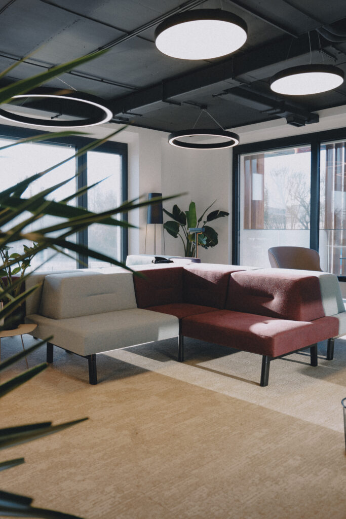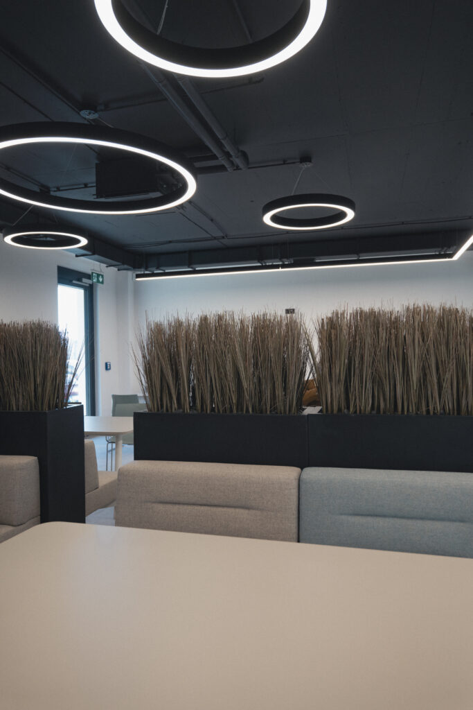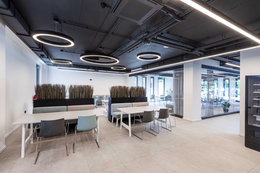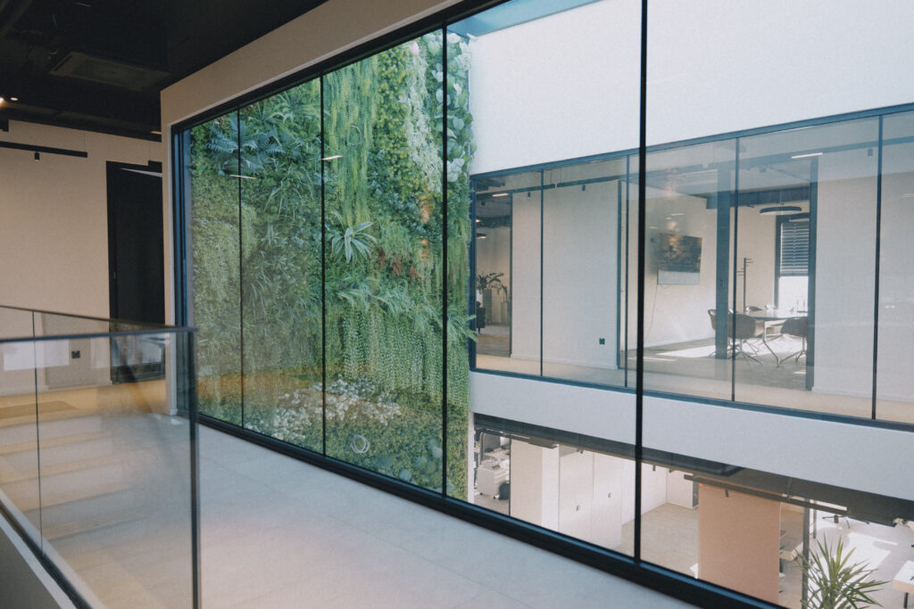 Trospratna zgrada nudi oko 2.400 m² kancelarijskog prostora, dopunjeno prostranim skladištem površine 3.000 m². Kancelarije su raspoređene u spoljnim krugovima zgrade, dok centralni blok uključuje servisne prostore poput otvorenih kuhinja, staklenih sala za sastanke i toaleta. Glavna atrakcija zgrade je veliki atrijum s dvoetažnim zelenim zidom, koji stvara inspirativnu atmosferu na ulazu. U ovom prostoru nalaze se velike konferencijske sale, dok coworking zona na prvom spratu pruža dodatni prostor za timski rad.