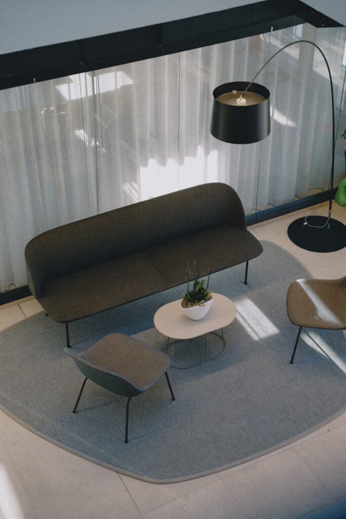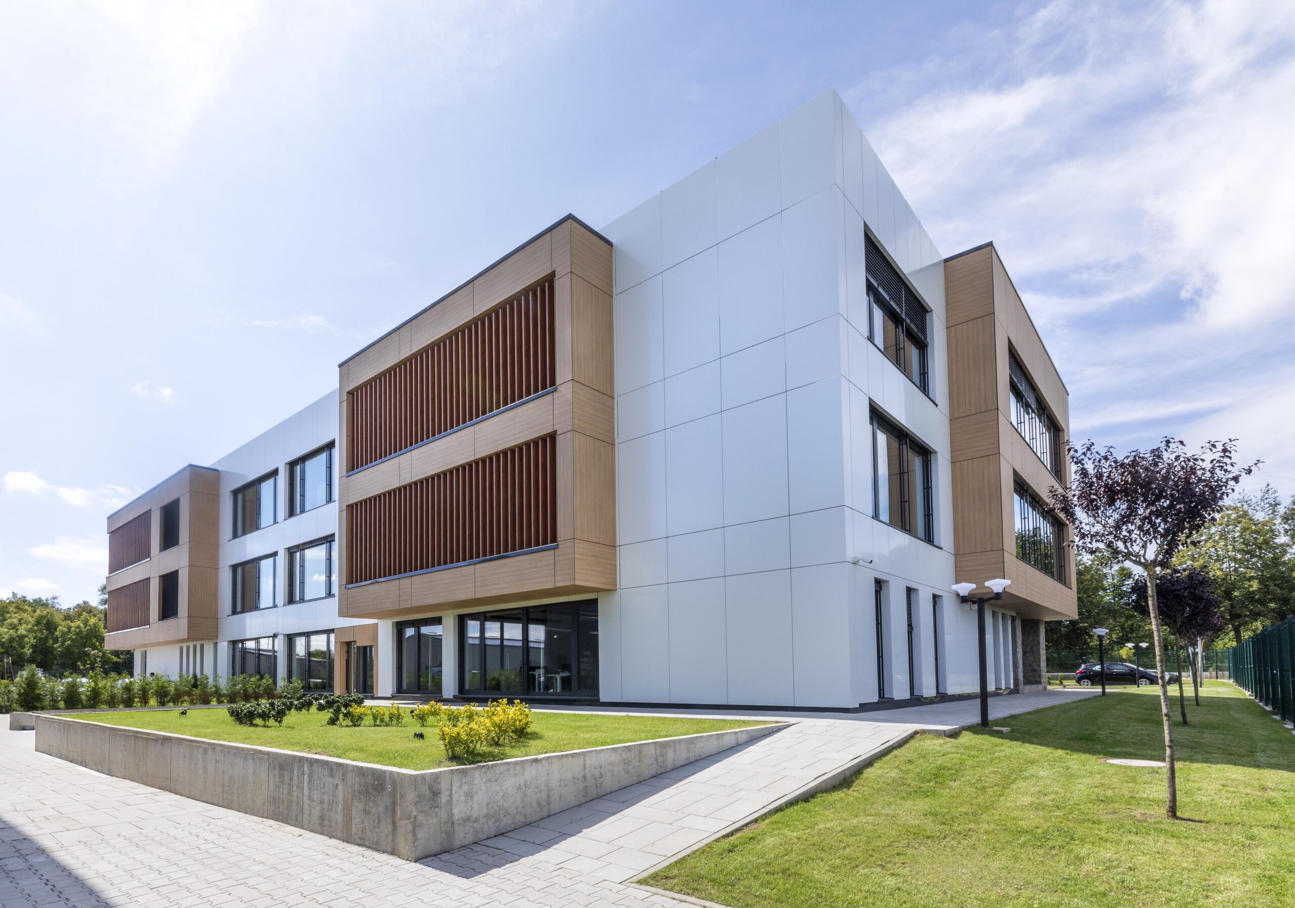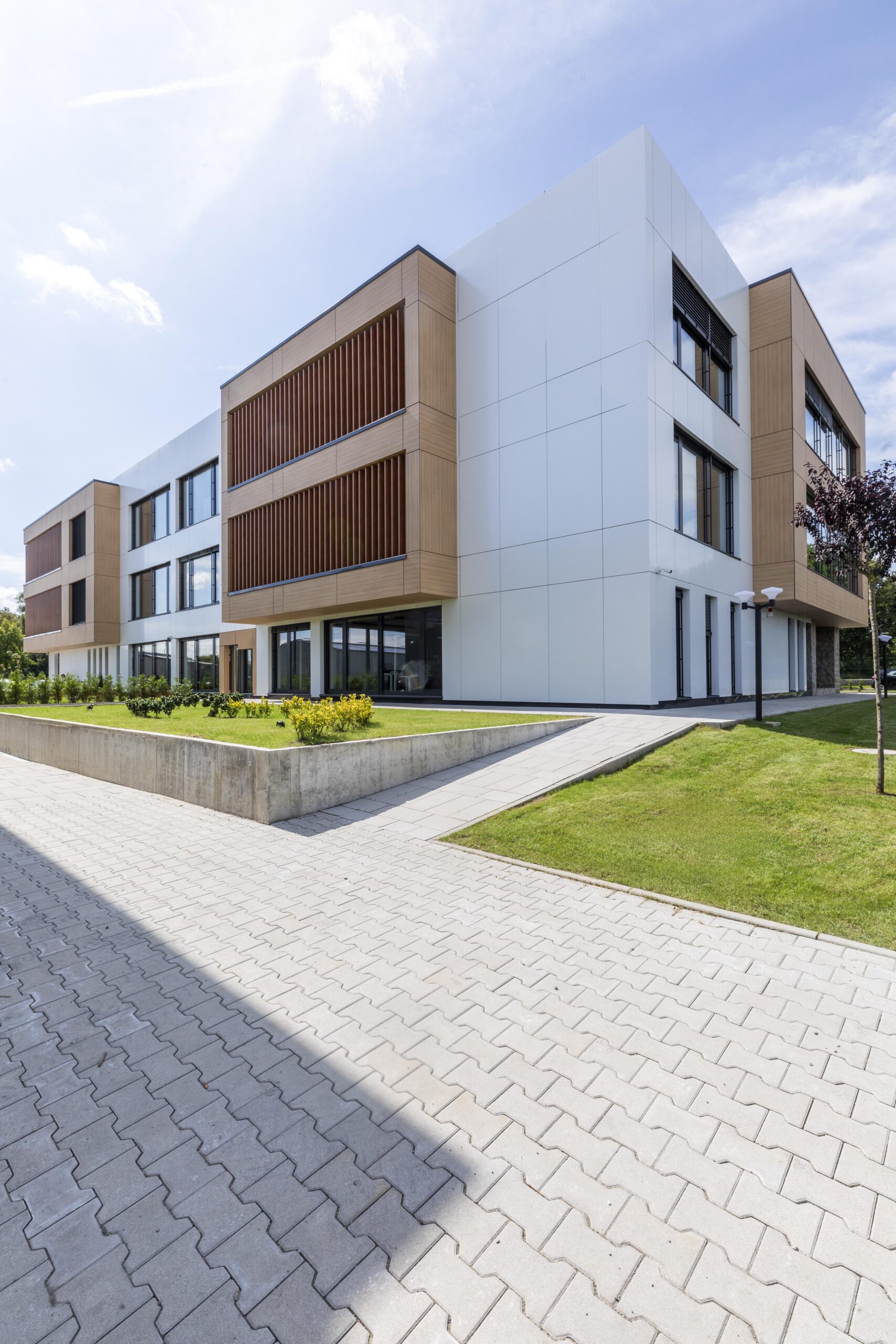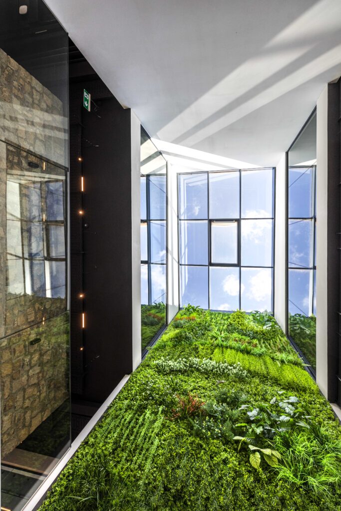 Dizajn odražava spoj modernosti i tradicije: bijela fasada od Aluko-Bonda sa sivim detaljima dopunjena je Trespa panelima s teksturom drveta i prirodnim kamenom – pažljivo osmišljeni hommage Crnoj Gori. Na najvišem spratu, krovna terasa sa maslinama i oleandrima poziva na opuštanje i harmonično zaokružuje koncept.