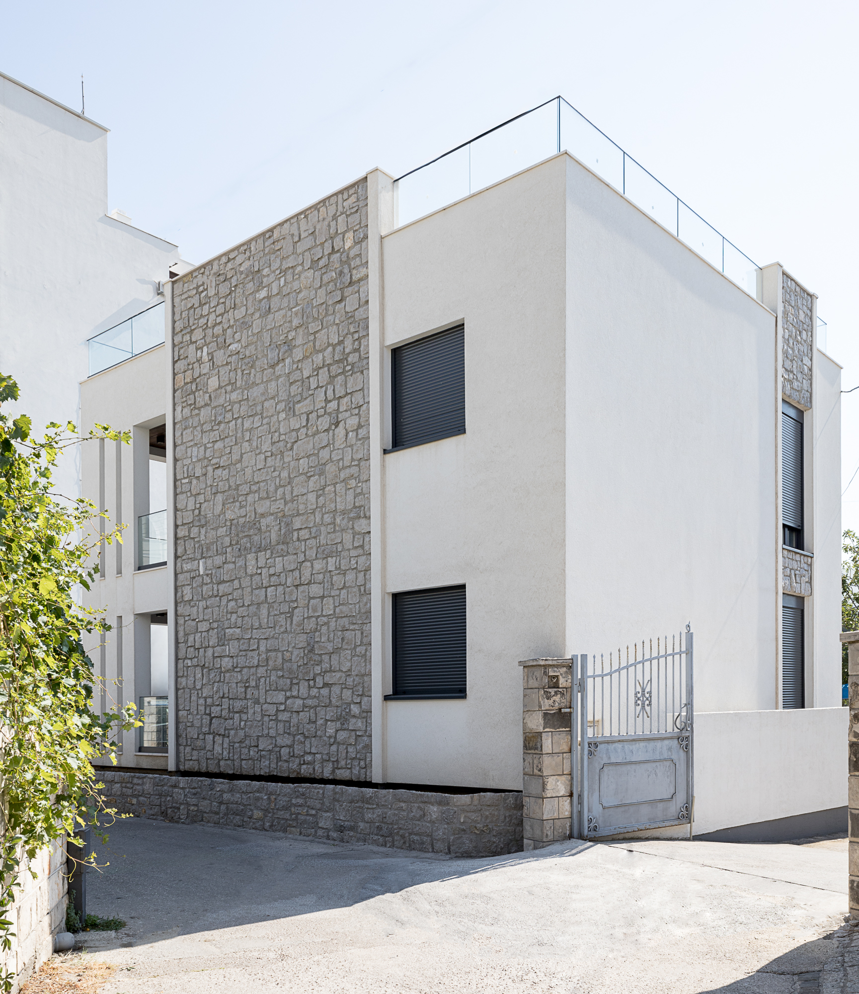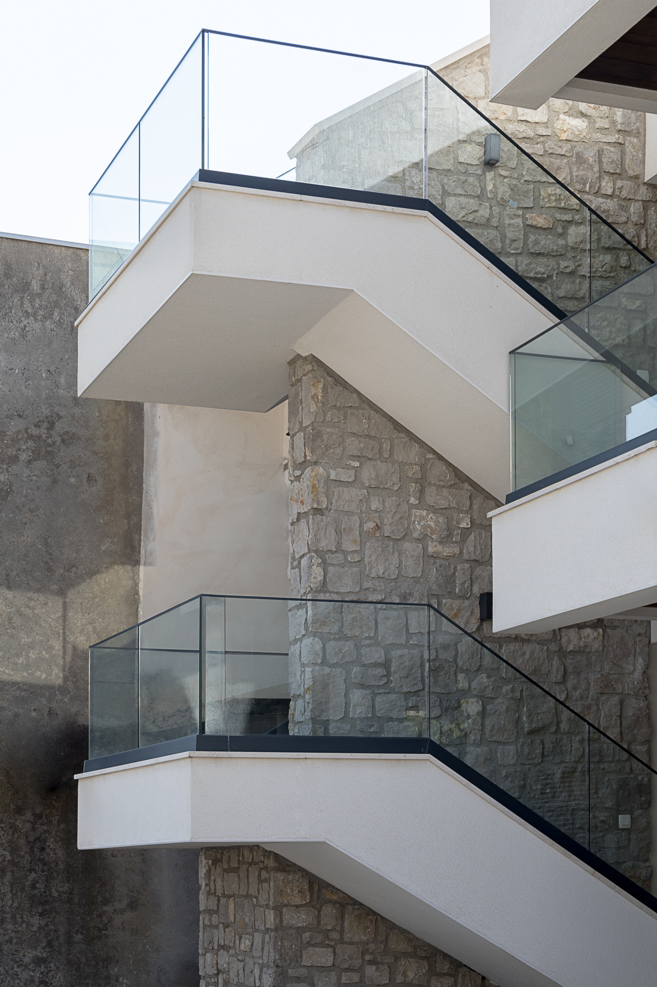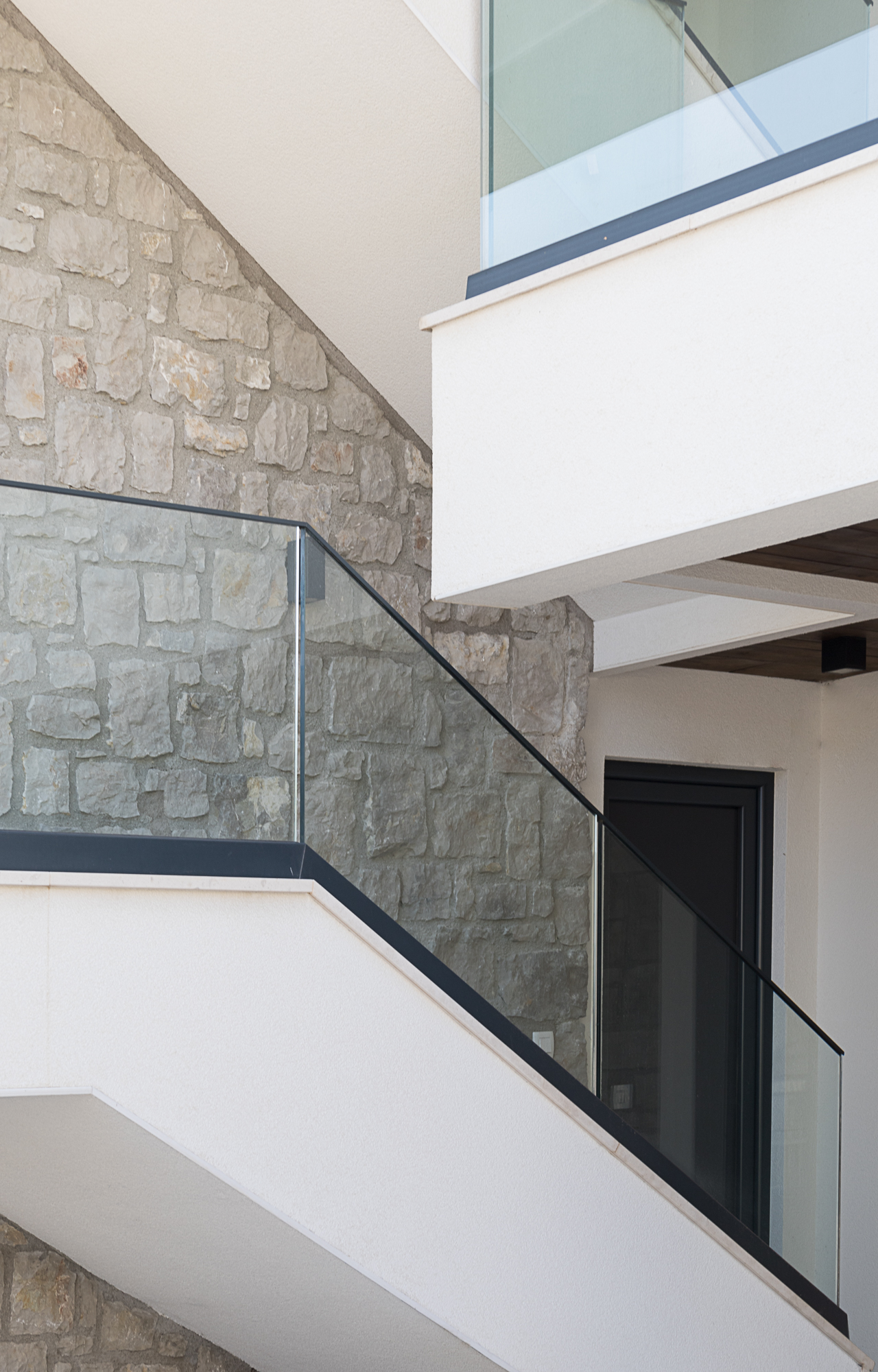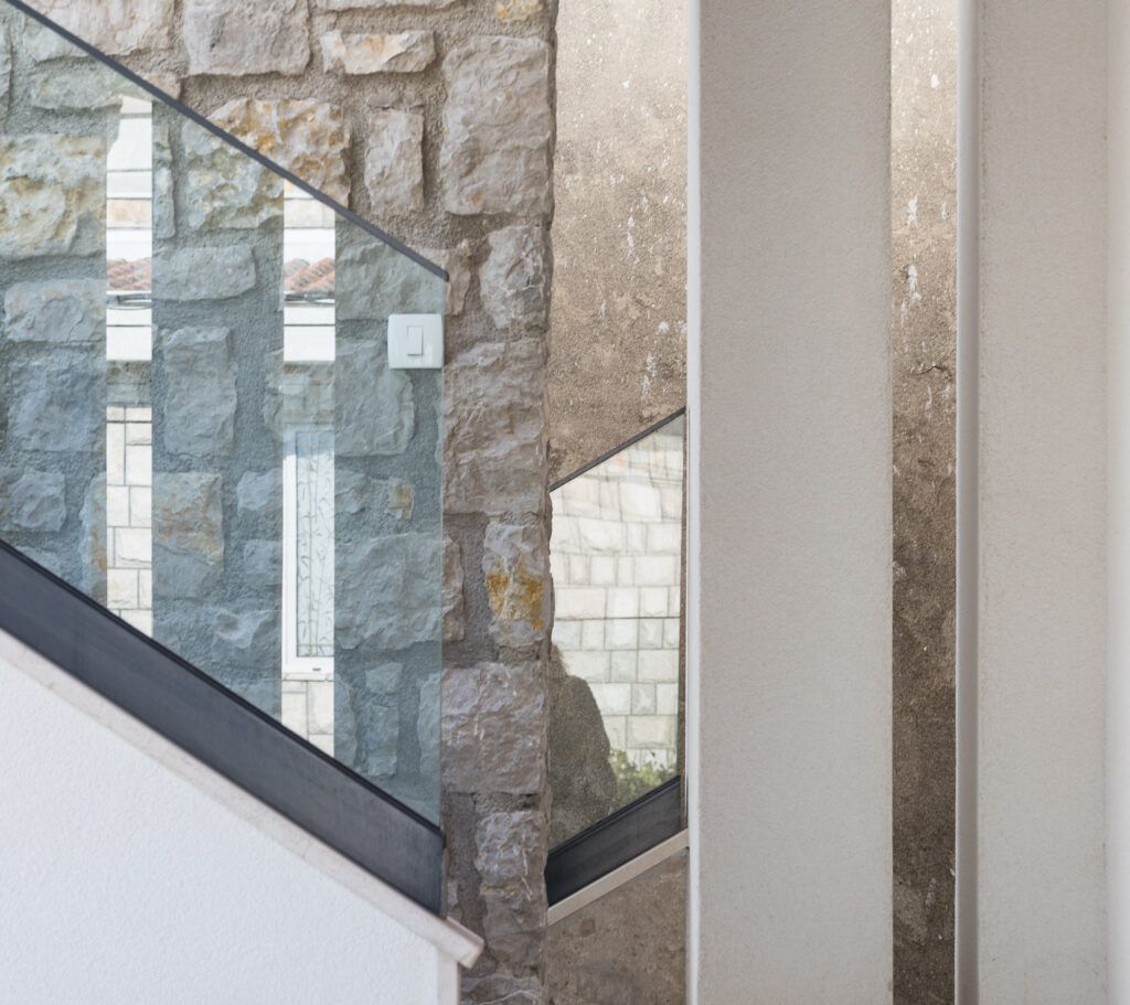 Vertikalna komunikacija objekta riješena je naglašenim spoljnim stepeništem, koje je elegantno uklopljeno u cjelokupan dizajn i uokvireno zidovima od prirodnog kamena. Jasna arhitektonska forma i minimalan izbor materijala daju kući bezvremenski estetski izgled koji se harmonično uklapa u okolni pejzaž.