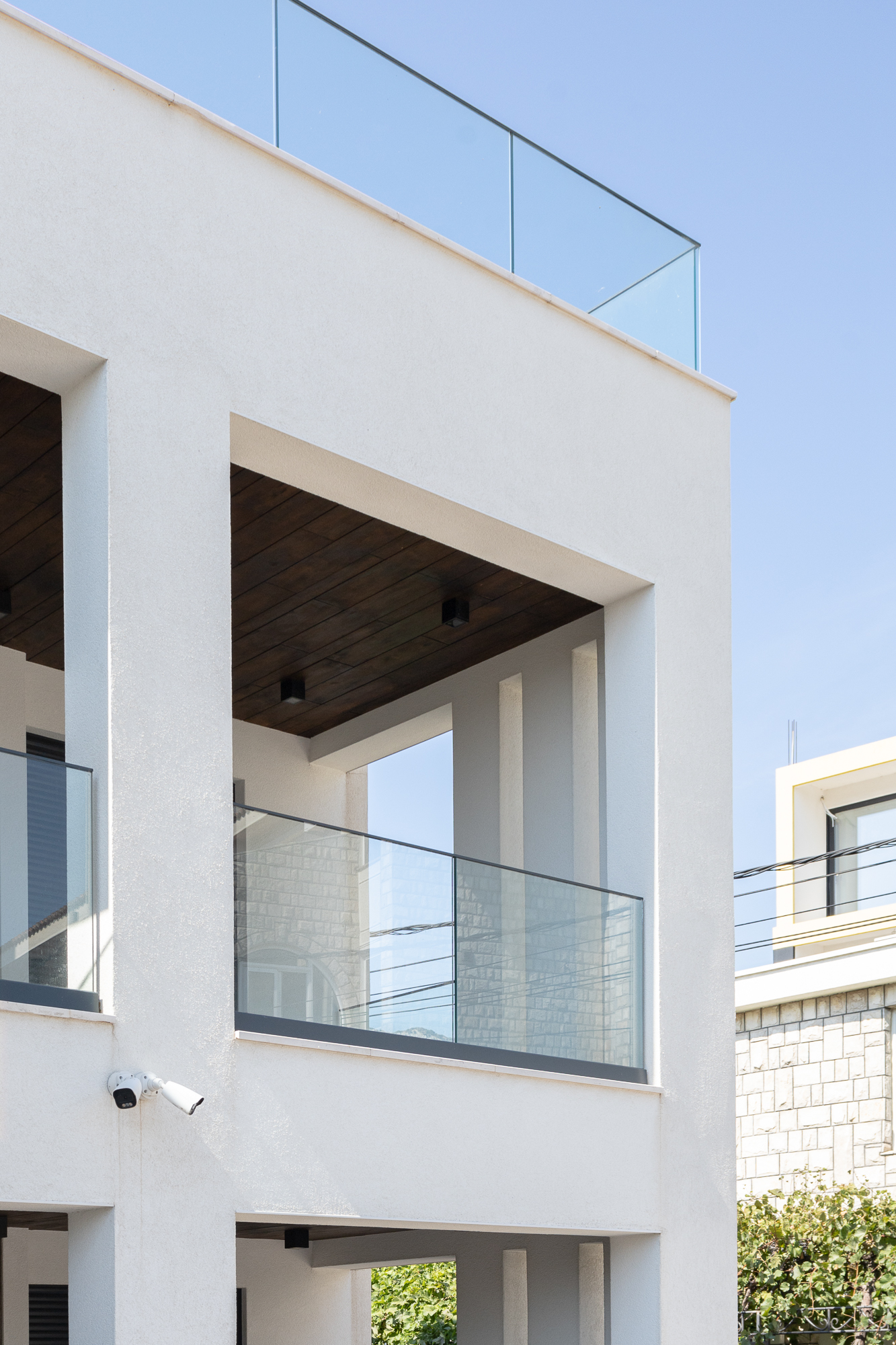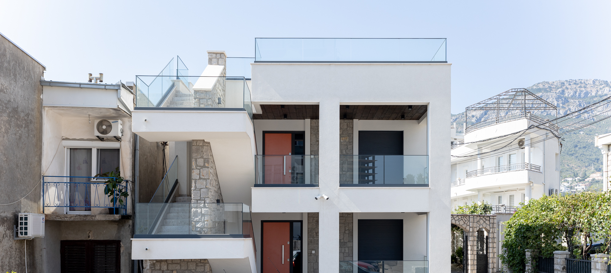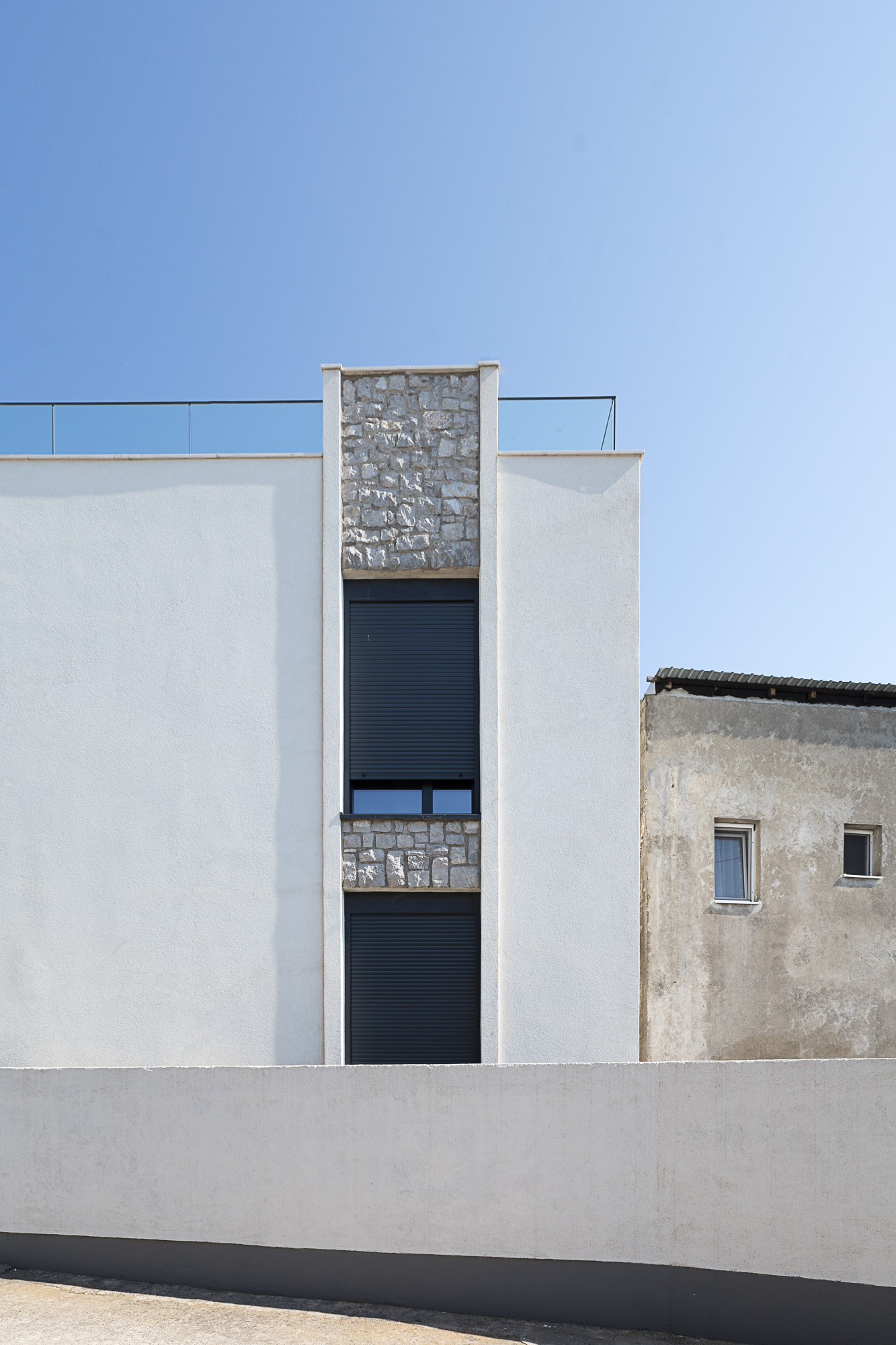 Vertikalna komunikacija objekta riješena je naglašenim spoljnim stepeništem, koje je elegantno uklopljeno u cjelokupan dizajn i uokvireno zidovima od prirodnog kamena. Jasna arhitektonska forma i minimalan izbor materijala daju kući bezvremenski estetski izgled koji se harmonično uklapa u okolni pejzaž.
